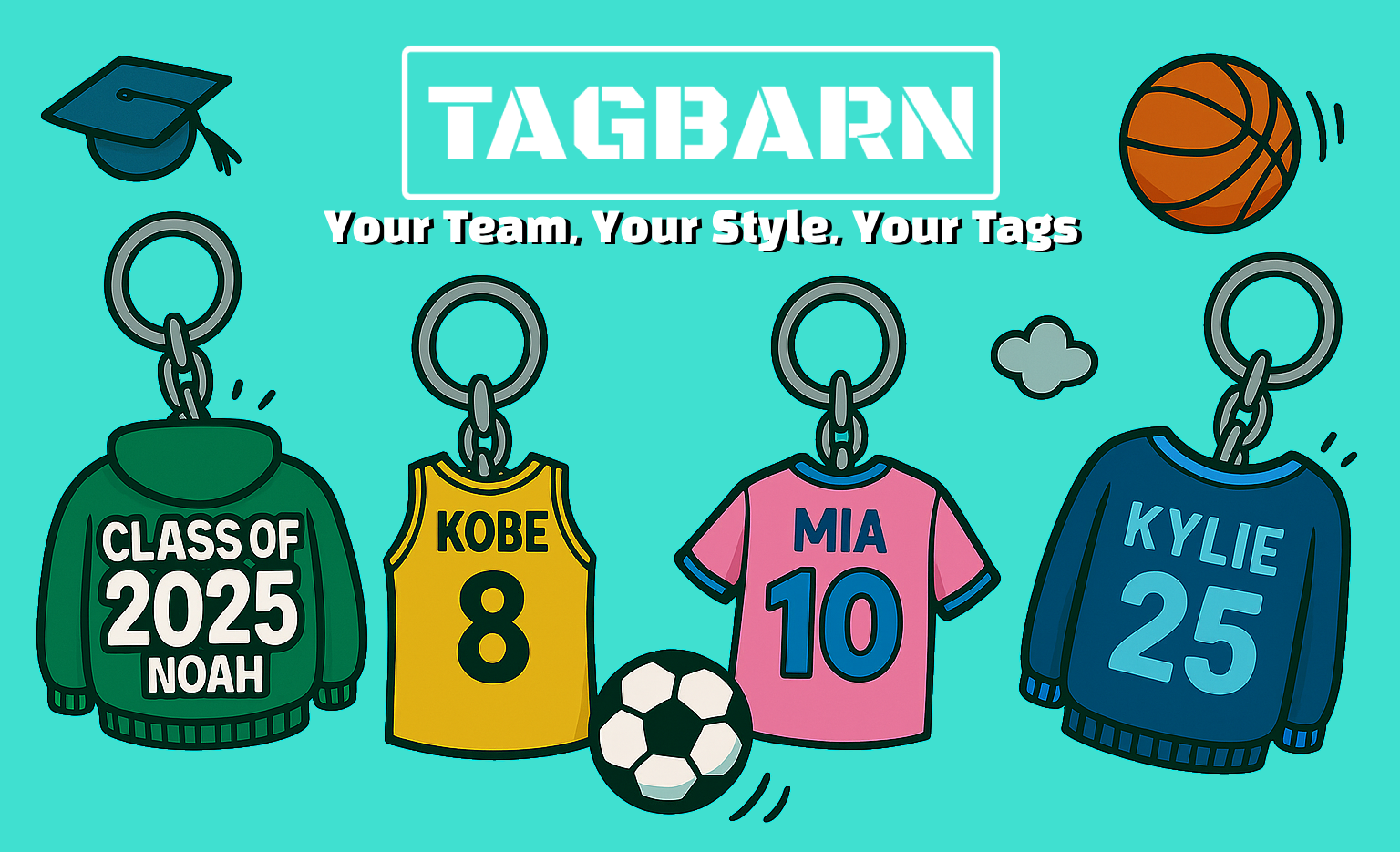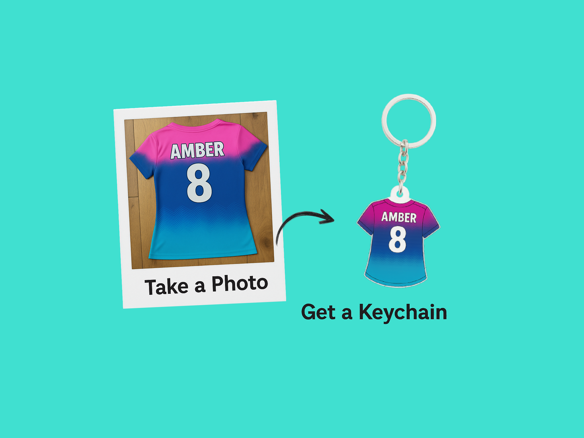 Every keychain is custom designed from your real photo — matching the exact colours, name and number.